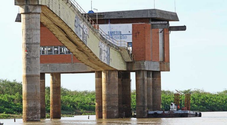 Uma balsa com cinco motobombas anfíbias foi colocada ao lado da estrutura de captação de água de Corumbá para a eventual emergência.