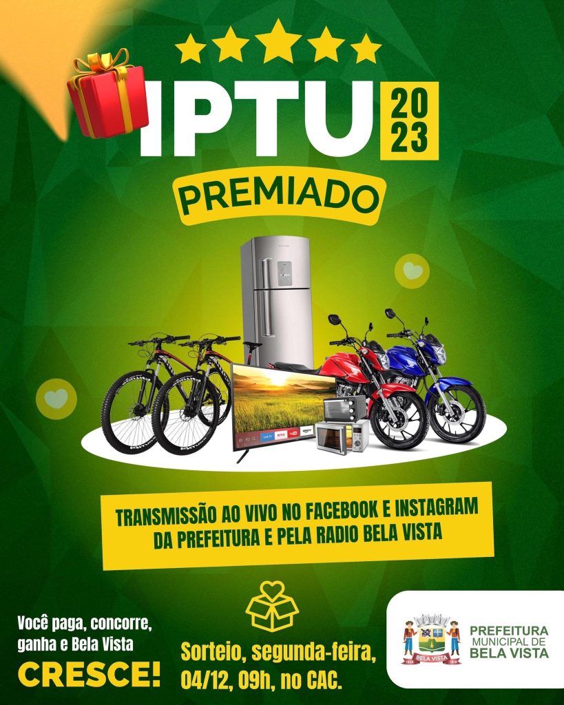 A Prefeitura de Bela Vista, por meio da Secretaria Municipal de Fazenda, realiza na próxima segunda-feira (4/12), no CAC – Centro de Atendimento ao Contribuinte, o sorteio do ‘IPTU Dá Prêmios 2023’, em que todos os contribuintes que estiverem com o Imposto Predial e Territorial Urbano em dia estarão concorrendo. Com transmissão AO VIVO, […]