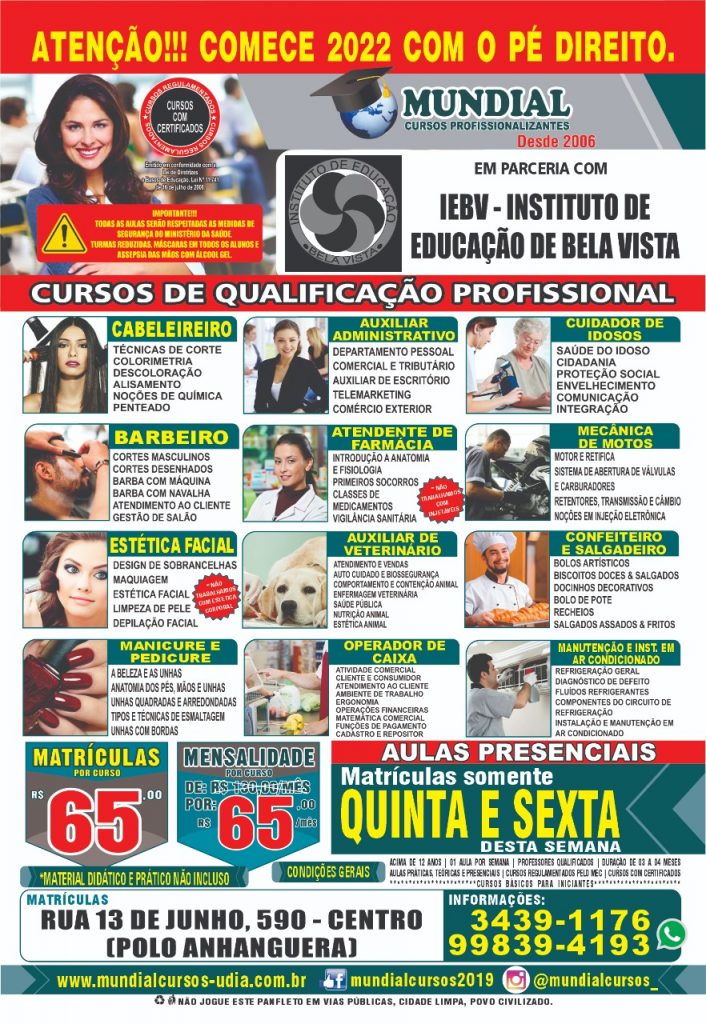 Através de uma parceria com o Instituto de Educação de Bela Vista, a renomada empresa “Mundial Cursos”, chegou em Bela Vista esta semana e anunciou a abertura de novas inscrições para diversos cursos de qualificações profissionais, são eles: