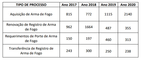 Conforme dados da Polícia Polícia Federal, de 2019 para 2020, o registro de armas cresceu 122%, passando de 893 para 1.985. Além disso, em 2019 foram feitos 460 requerimentos para porte de arma, dos quais 191 foram deferidos e em 2020 foram 313 requerimentos, dos quais 121 foram deferidos.