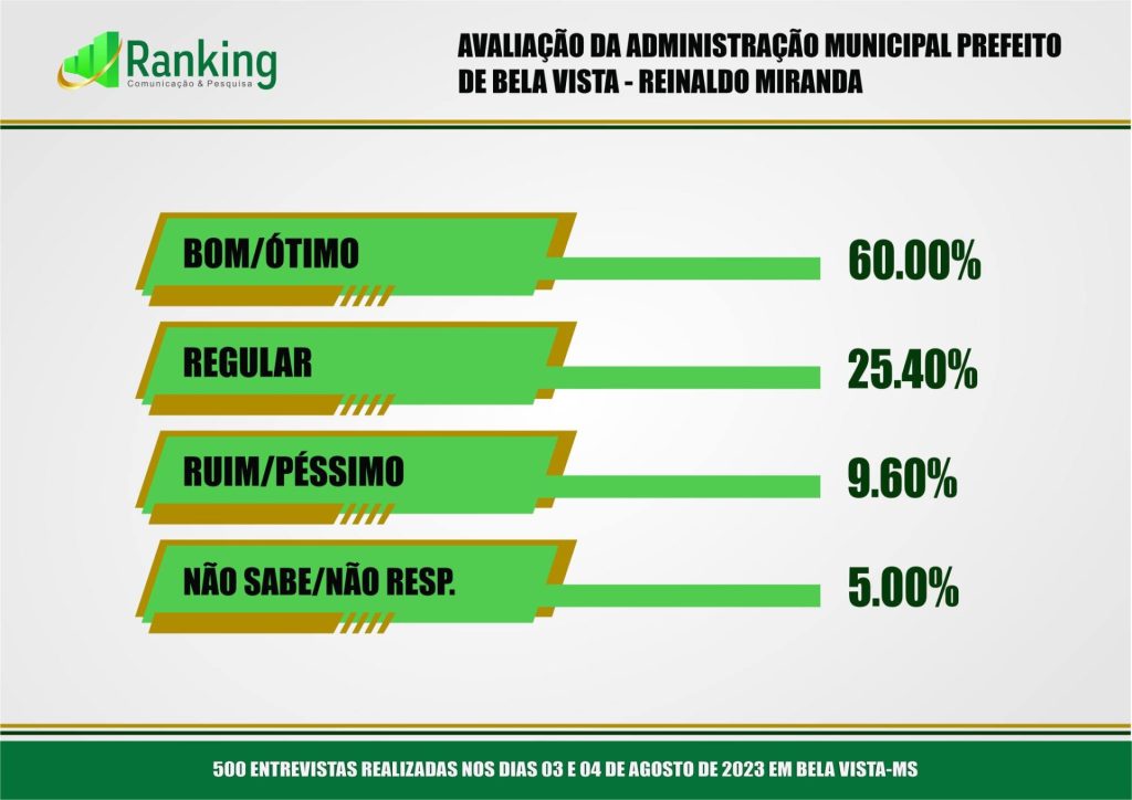 A pesquisa do Instituto Ranking Brasil Inteligência, encomendada pelo site Diário MS News e realizada nos dias 3 e 5 de agosto de 2023, junto a 500 moradores de Bela Vista, com 16 anos ou mais de idade, revelou que a administração do prefeito Reinaldo Miranda é considerada boa ou ótima para 60% da população.
