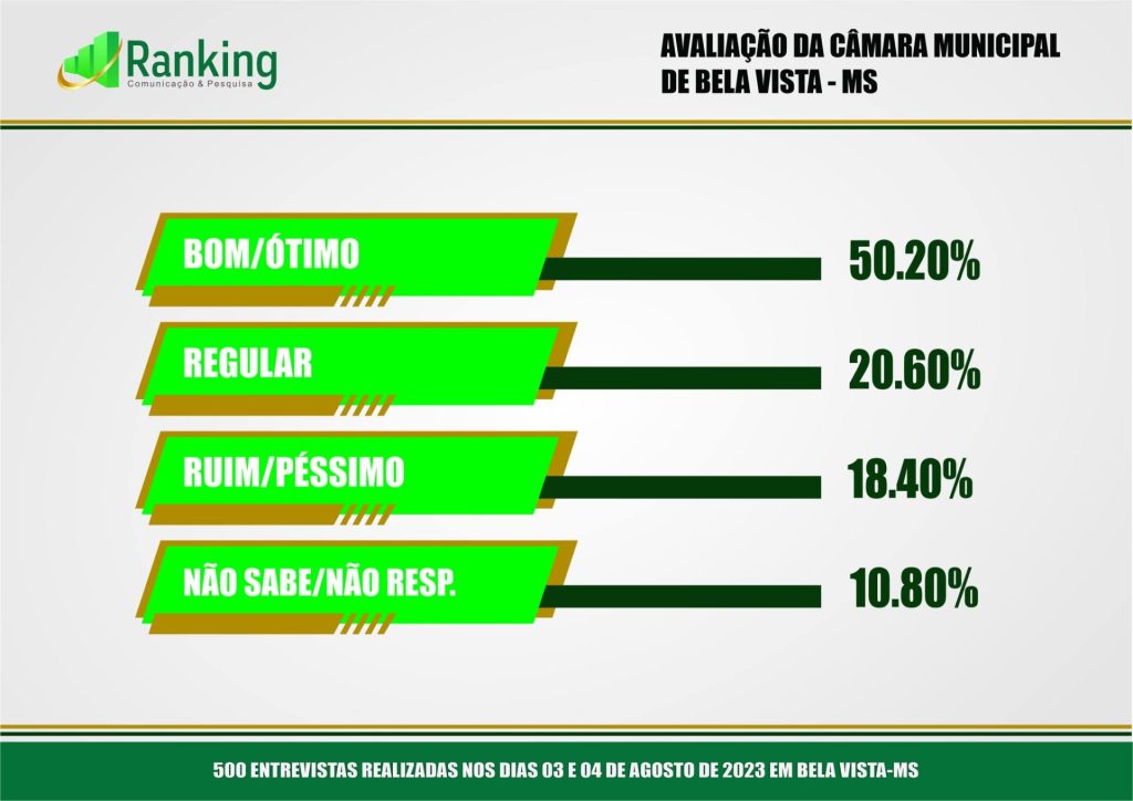 Já a avaliação da Câmara Municipal de Bela Vista aponta que a Casa de Leis é considerada boa ou ótima para 50,2% dos entrevistados, regular para 20,6% e ruim ou péssima para 18,4%, enquanto 10,8% não sabem ou não responderam.