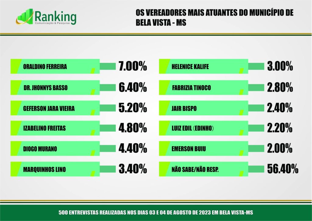 O Instituto Ranking Brasil Inteligência ainda levantou os vereadores mais atuantes em Bela Vista e Oraldino Ferreira aparece na frente com 7%, seguido por Dr. Jhonnys Basso, com 6,4%, Geferson Jara Vieira, com 5,2%, Izabelino Freitas, com 4,8%, Diogo Murano, com 4,4%, Marquinhos Lino, com 3,4%, Helenice Kalife, com 3%, Fabrizia Tinoco, com 2,8%, Jair Bispo, com 2,4%, Luiz Edil, o “Edinho”, com 2,2%, e Emerson Buiu, com 2%, sendo que 56,4% dos entrevistados não sabem ou não responderam.